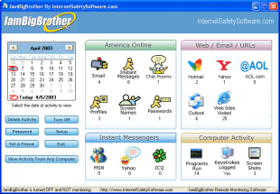 IamBigBrother records all of the internet activity for many programs including America Online, MSN, Outlook Express and more. And it logs all keystrokes typed in EVERY program along with screen shots. So basically IamBigBrother monitors EVERYTHING on your computer!